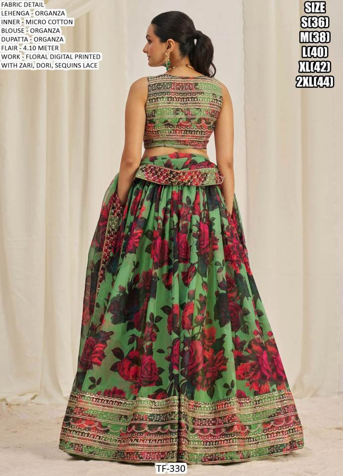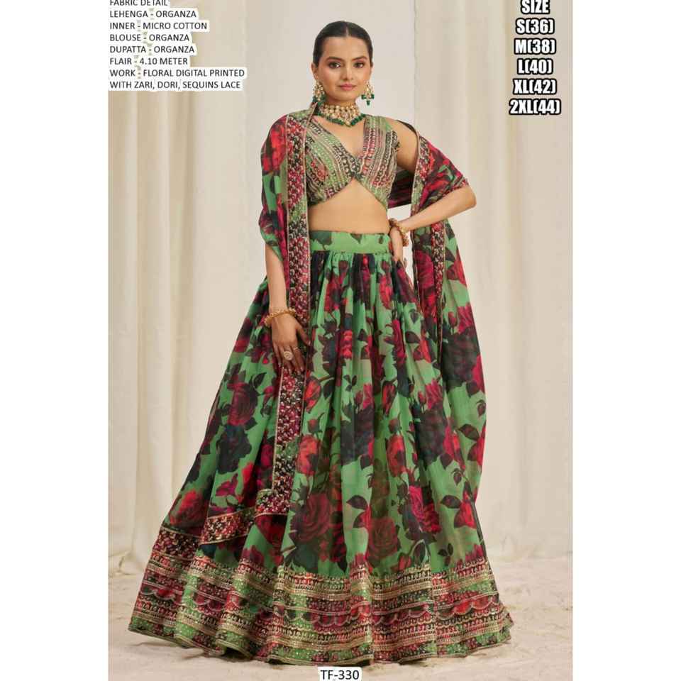 Nouvelle collection de lehenga choli en organza de créateur, tenue de soirée moderne avec imprimé floral numérique, travail de zari, de dori et de paillettes