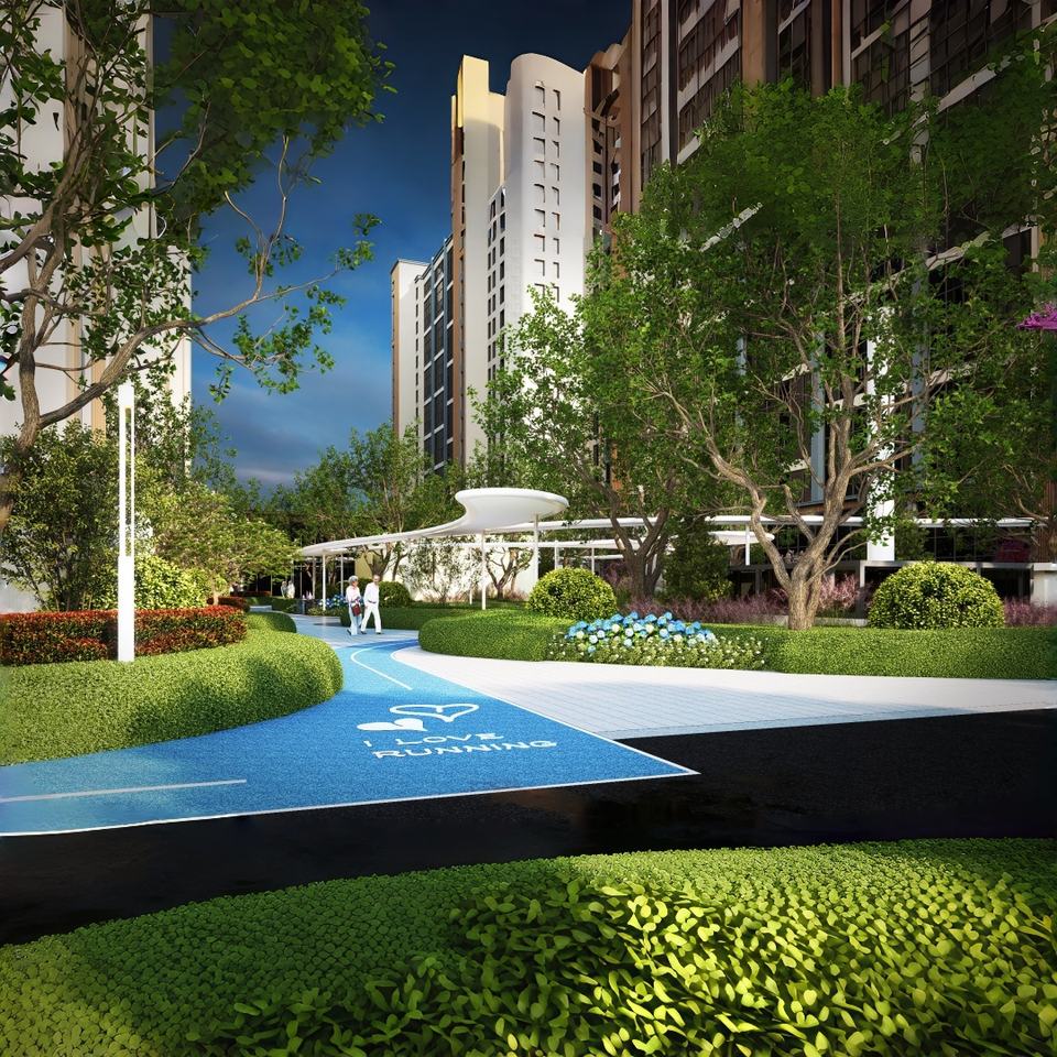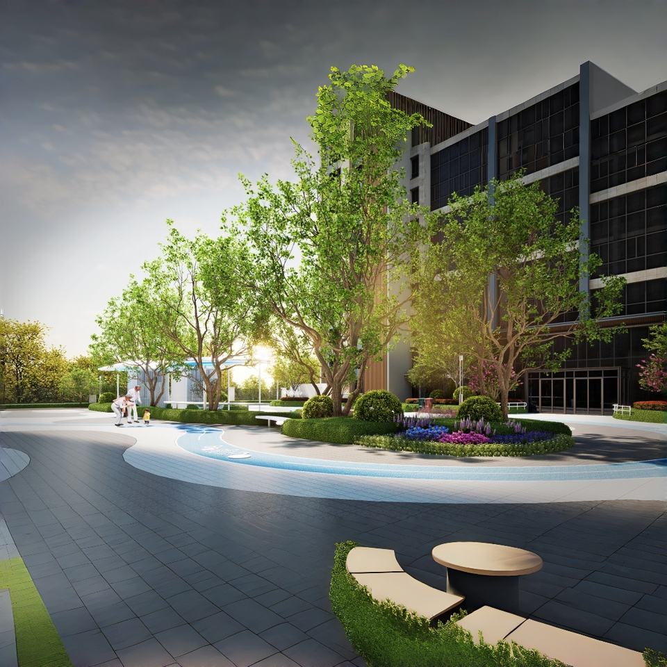 Plan d'étage de rendu 3D moderne libre de paysage de Nexus pour la planification de cour de loisirs extérieurs de communauté de protection de l'environnement