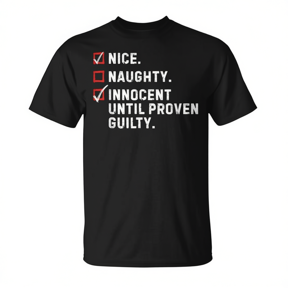 T-shirt de Noël « Joli, coquin, innocent jusqu'à preuve du contraire » – Cadeau promotionnel de Noël pour hommes/femmes