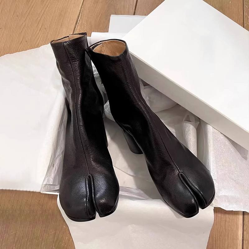Bottes à talon carré amincissant mi-mollet en cuir véritable à bout fendu pour femme, style Niche, polyvalentes au quotidien