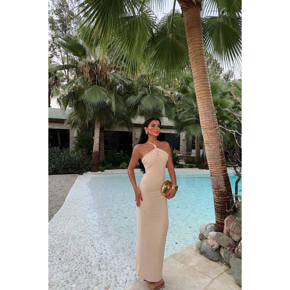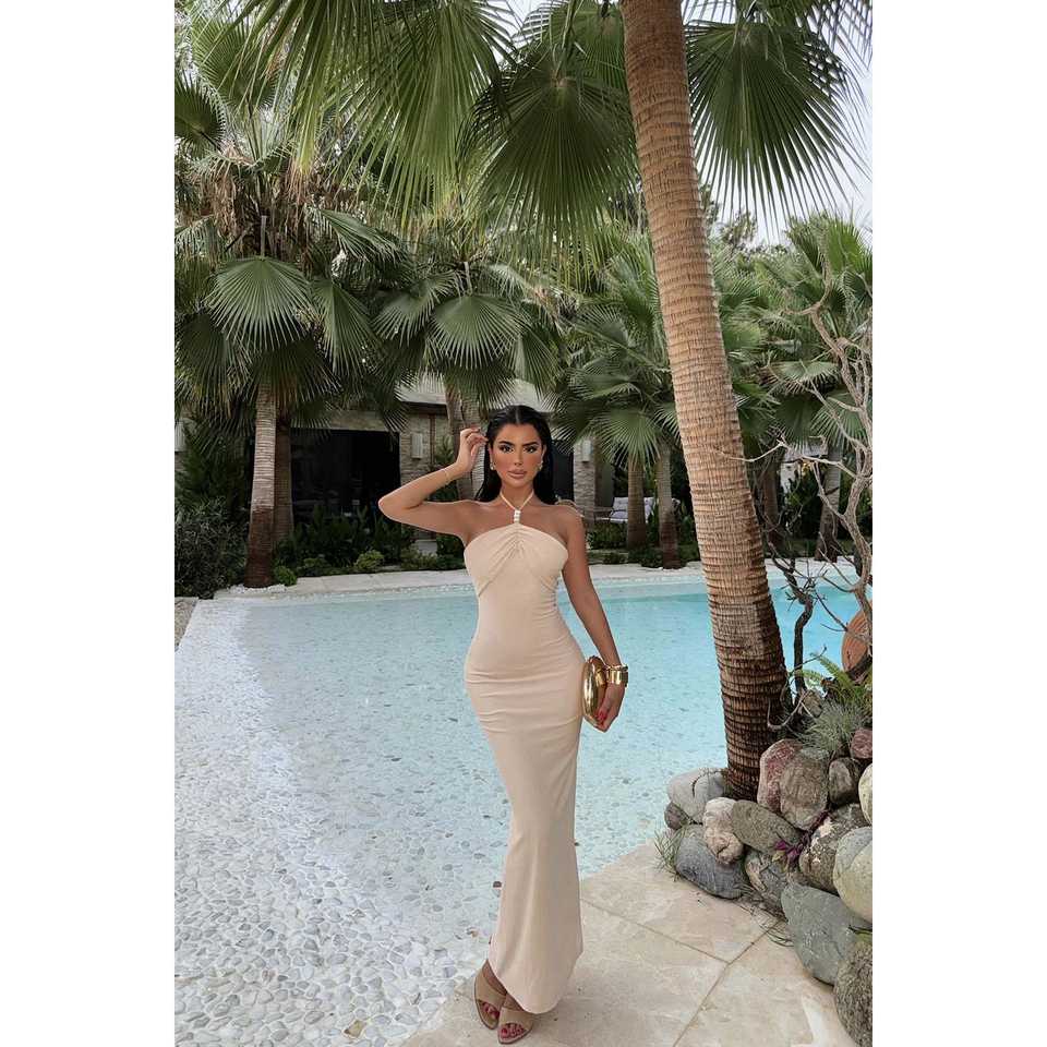 Nina Luxury Satin Evening Dress Pearl Detail Simple Style Halter Neck Strapless Straight Floor-Length Available XS XL Polyester
