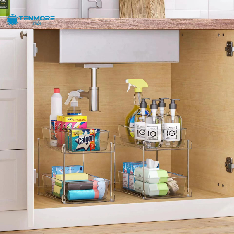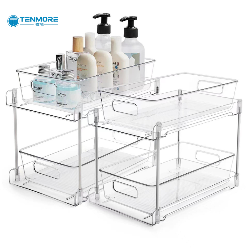 Panier de rangement coulissant antidérapant à 2 niveaux en plastique PS transparent pour sous l'évier, idéal pour salle de bain, cuisine et garde-manger