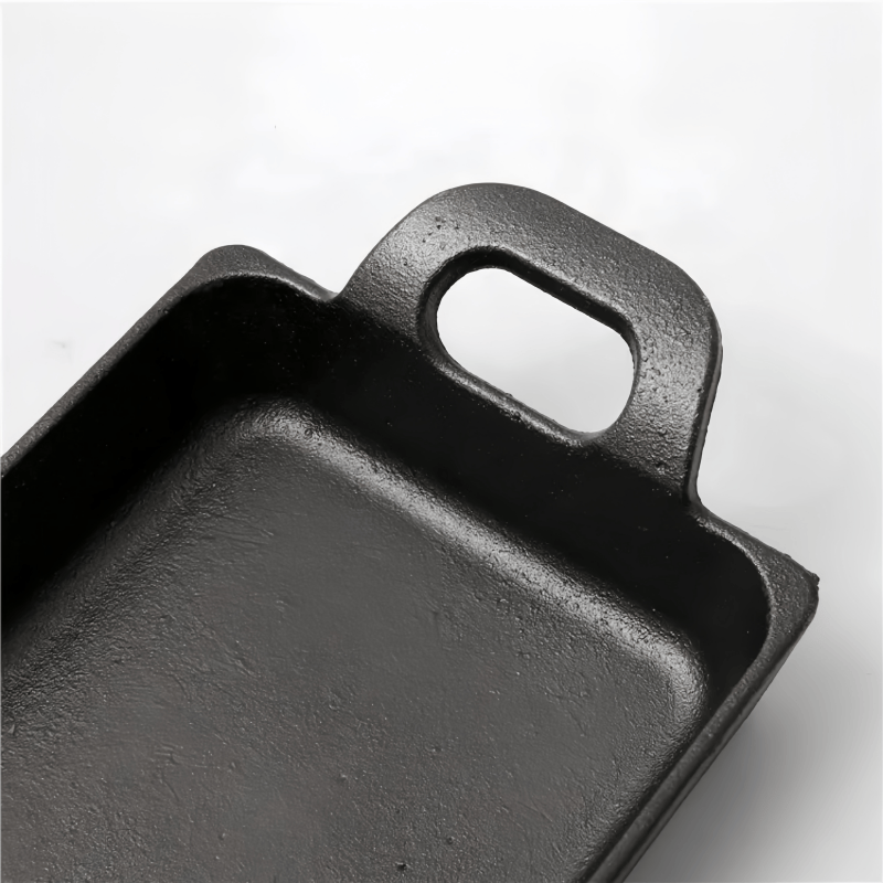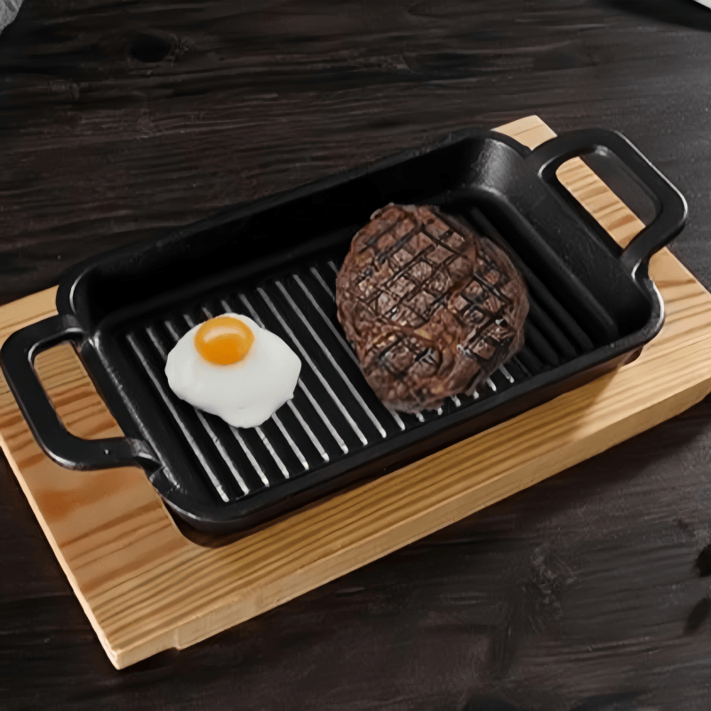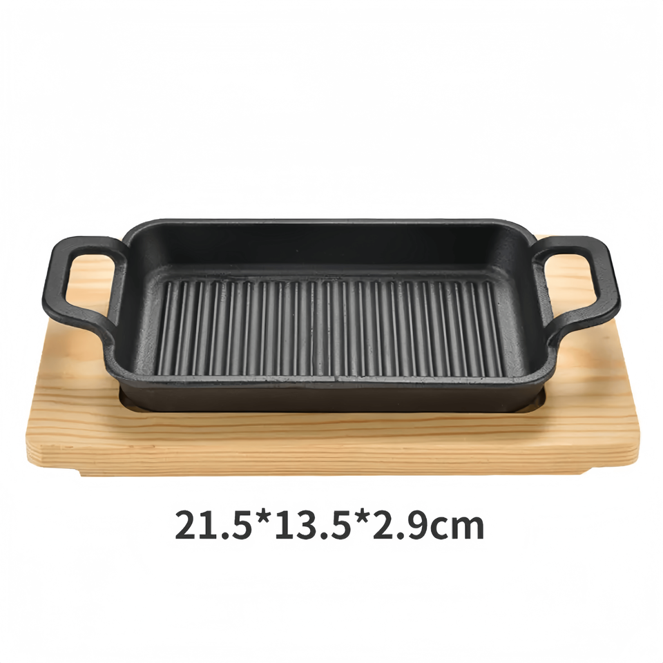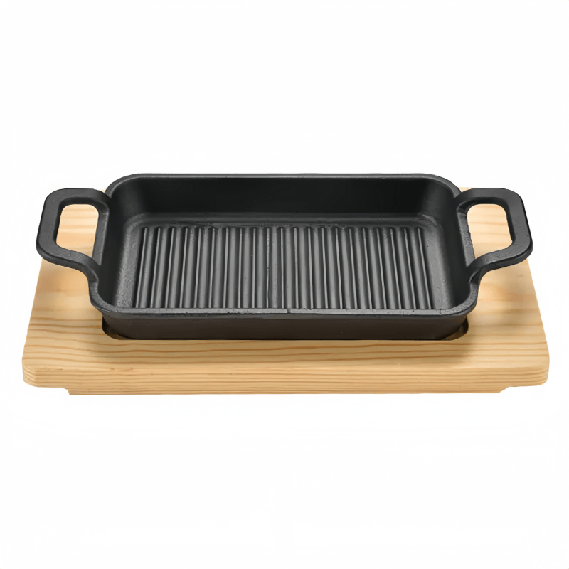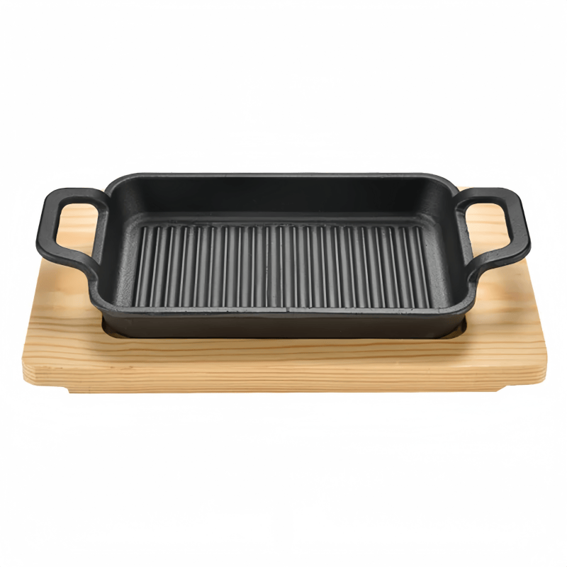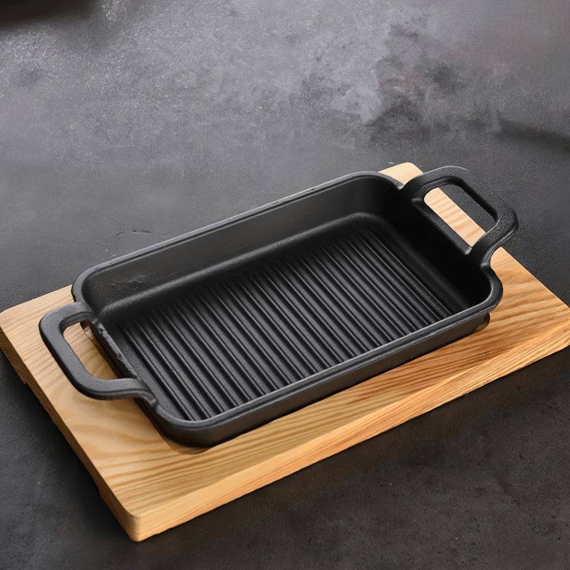 Plaque rectangulaire en fonte multifonctionnelle antiadhésive avec base en bois