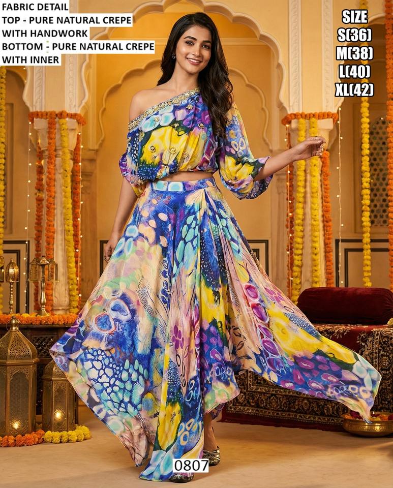 Ensemble brodé Noor Rang pour femme, moderne, séchage rapide, style Bhandhani, asymétrique, en crêpe, longueur ras du sol, idéal pour les fêtes toutes saisons