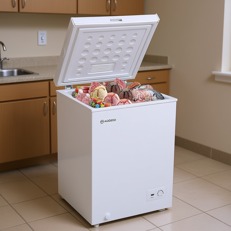 Congélateur coffre Noosoo 3,5 pieds cubes, porte simple, dégivrage manuel, usage domestique, blanc