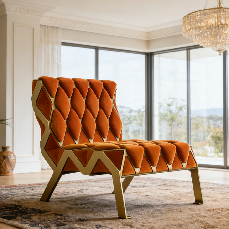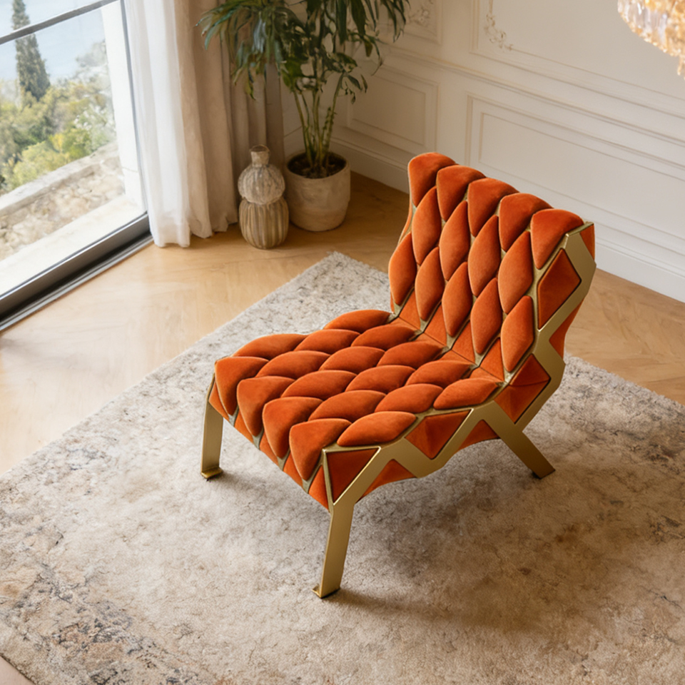 Fauteuil d'appoint créatif nordique géométrique en tissu safran, base en acier doré, mobilier d'hôtel