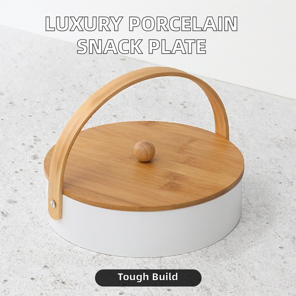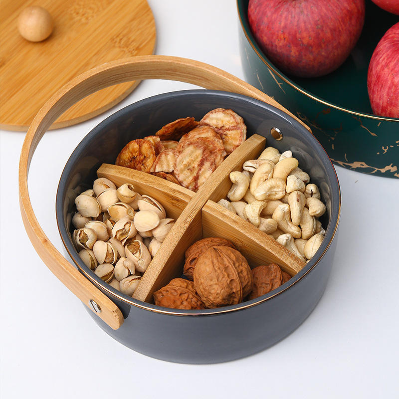 Plat en céramique profond de collation de porcelaine portative de luxe nordique avec le couvercle de poignée en bambou pour le dîner de Table de thé de plateau de fruits de partie