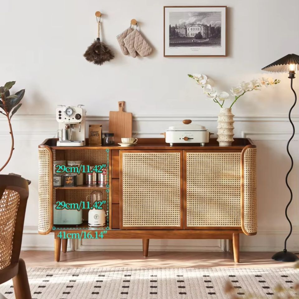 Buffet nordique moderne du milieu du siècle en bois de frêne massif et rotin naturel tressé pour salons et salles à manger - Écologique
