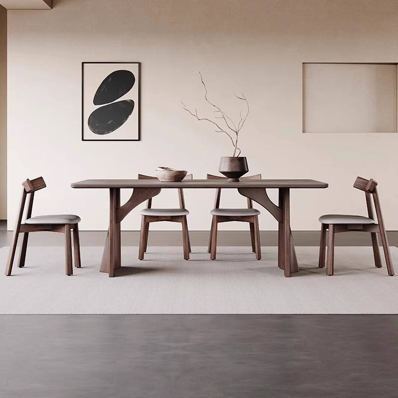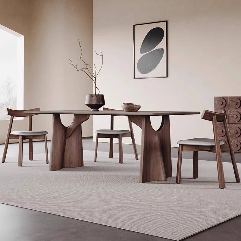 Table à manger rectangulaire en bois massif nordique, couleur noyer, style moderne minimaliste, structure stable en bois courbé, salle à manger