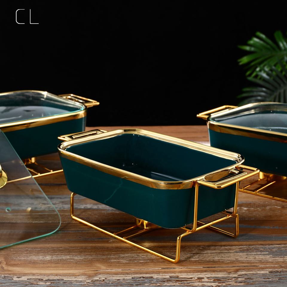 Ustensiles de cuisson en céramique de Style nordique peints à la main à bord doré plat de cuisson rectangulaire avec couvercle 3 tailles casserole avec support