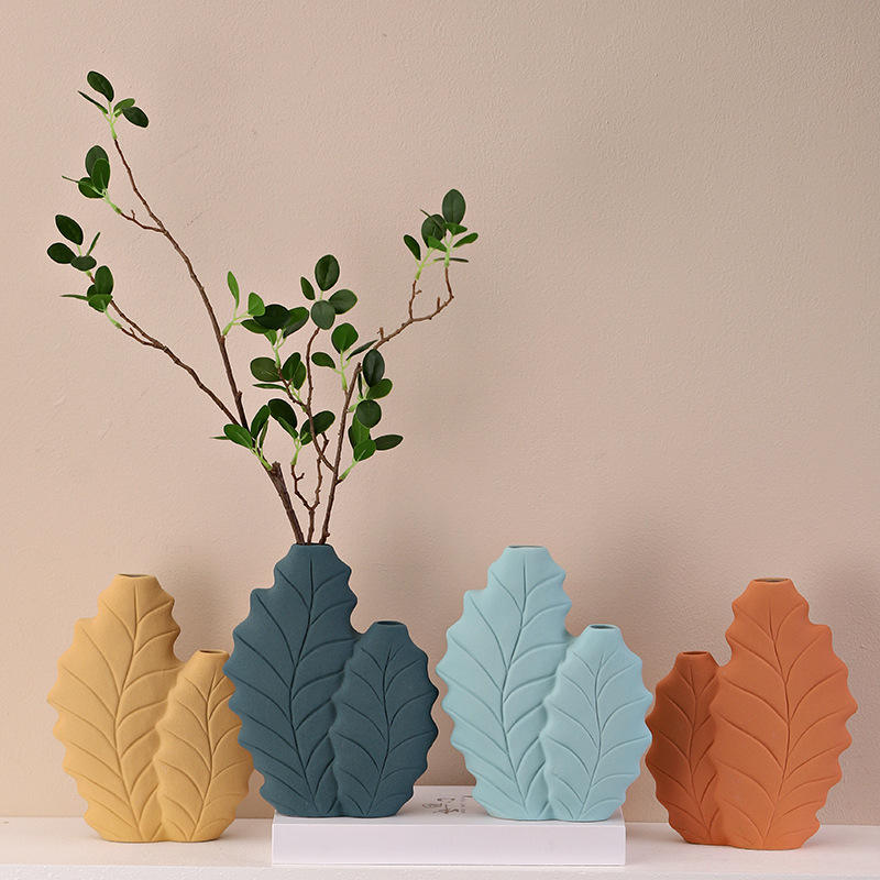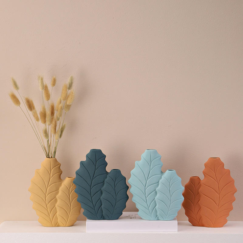 Nordic Style Morandi Color Botanical Leaf Form Ceramic Vase With Hand Painted Finish for Dried Fresh Flower Display
