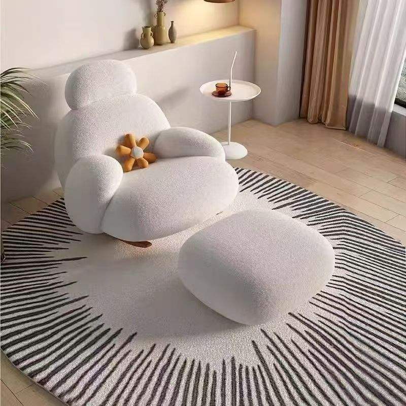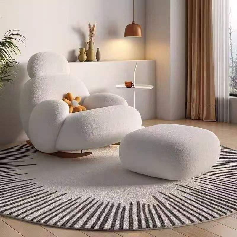 Fauteuil à bascule style nordique avec repose-pieds, en peluche blanche, pour salon, chambre ou balcon.