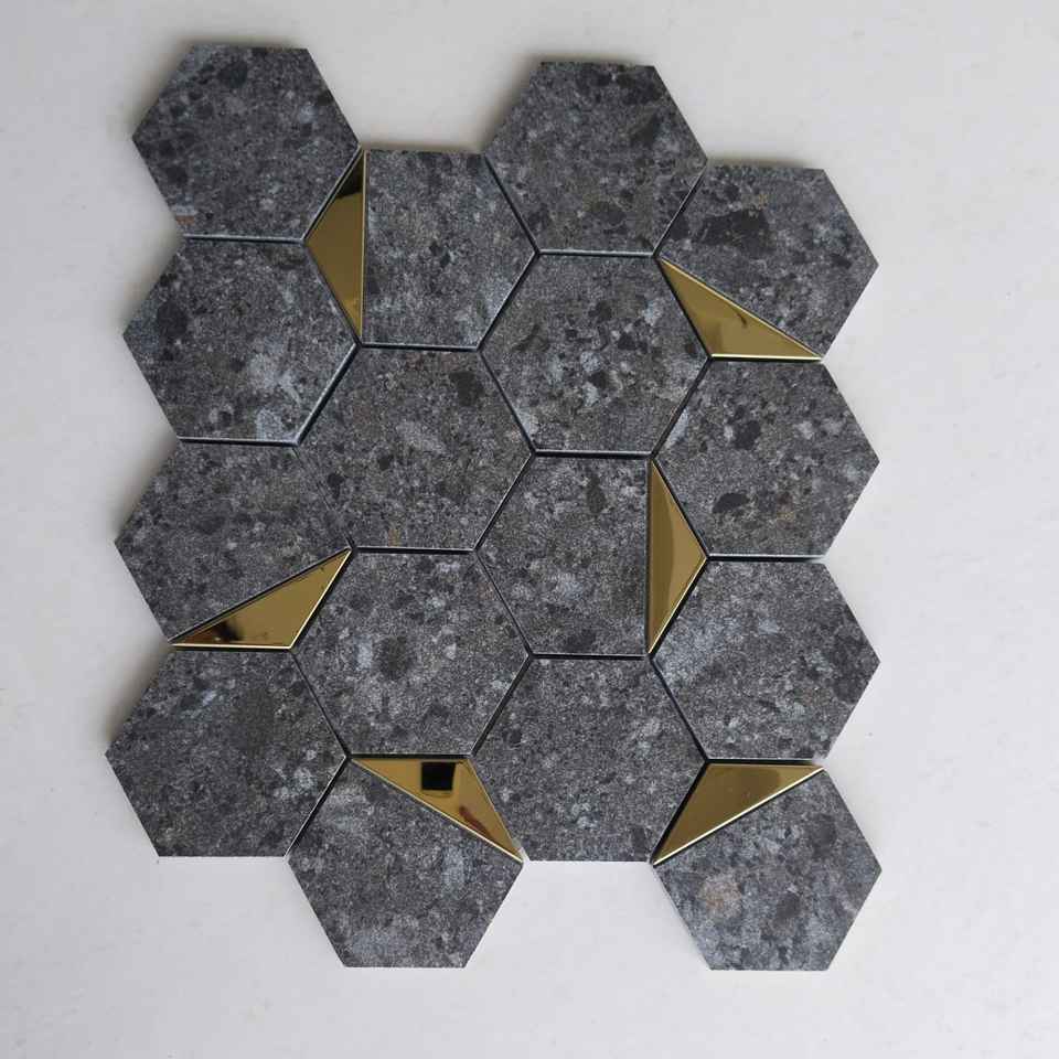 Norr Graphite 3 pouces 73mm hexagone mosaïques murales Unique moderne métal or pierre verre céramique maille porcelaine pour salle de bain