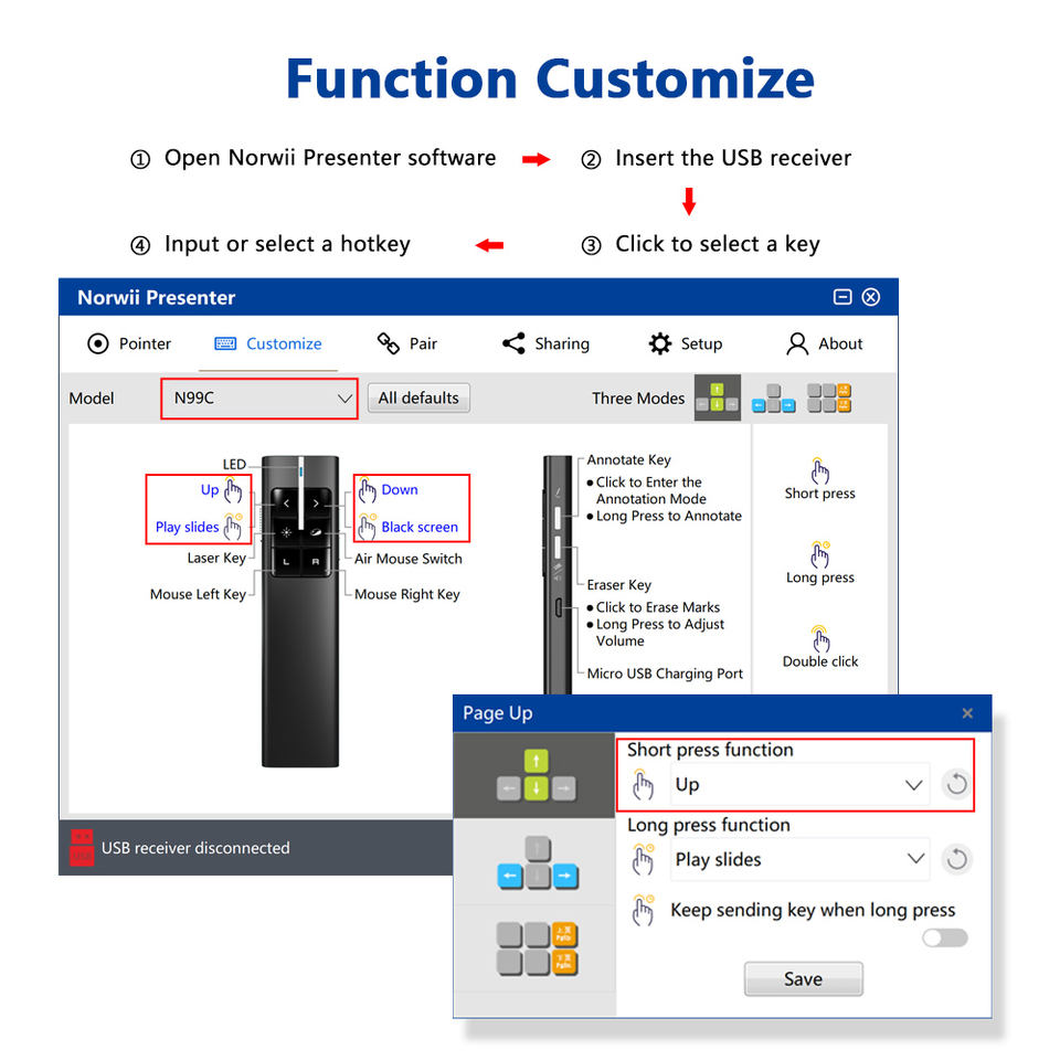 Présentateur sans fil USB Norwii N99 2,4 GHz, pointeur laser rouge, stylos de présentation
