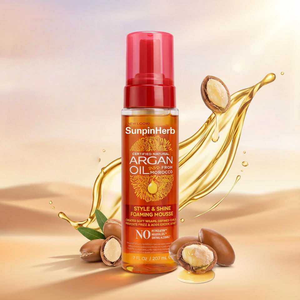 Mousse coiffante légère à l'huile d'argan, texture fine, non grasse, tenue anti-frisottis, usage quotidien