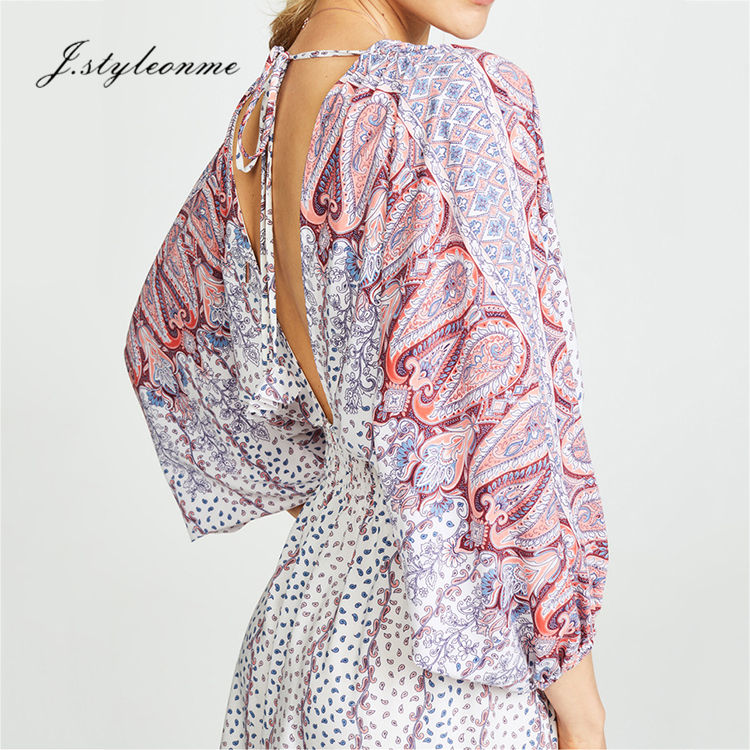 Nouveau Design Femmes Robe Imprimer V cou Lanterne Manches Manches Longues Taille Haute Super maxi Robe Femmes