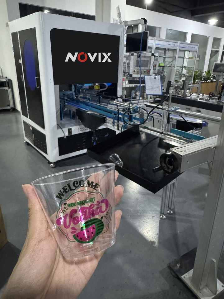 Imprimante UV jet d'encre numérique Novix 360 pour gobelets en plastique jetables, impression couleur intégrale sur gobelets en aluminium, bouteilles en verre et tasses
