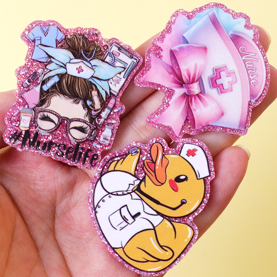 Clip à bobine en acrylique pailleté de couleur infirmière, médecin, plat, en plastique, pour badge de travail, porte-clés, décoration de coque de téléphone