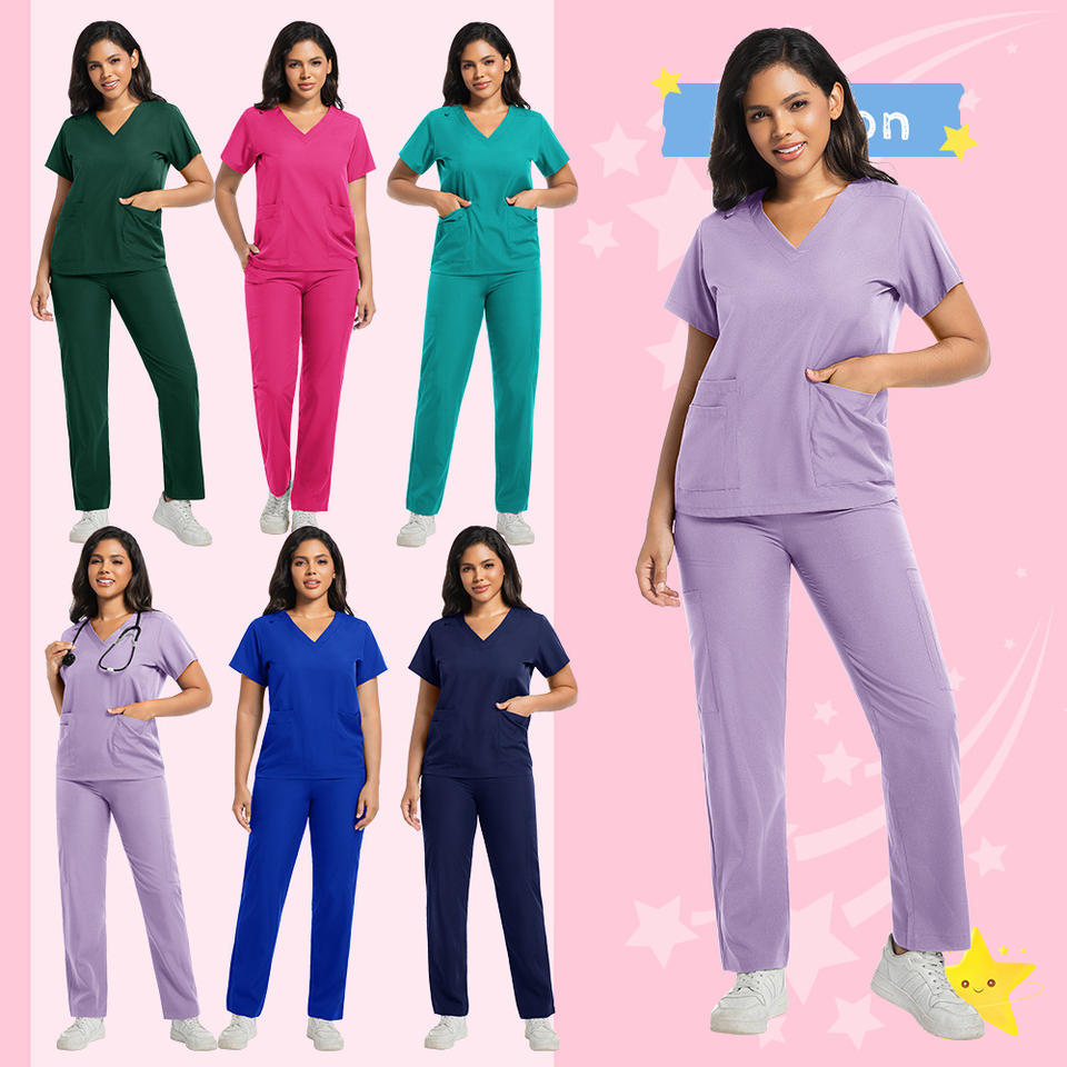 Nurse Uniform Set Solid Color Short Sleeve Long Pants Two Piece Scrub Women Moisture Wicking Hospital Workwear