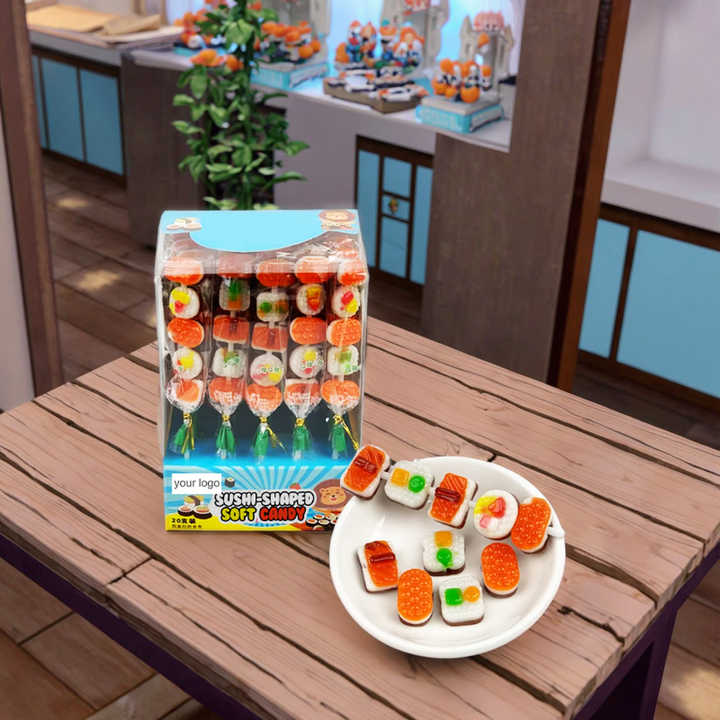 ODM Bonbons Vente en Gros Personnalisé Marque Privée Nourriture Halal Sushi Forme Gummy Candy Stick Sweet Jelly Fudge Bonbons Jouet pour Enfants