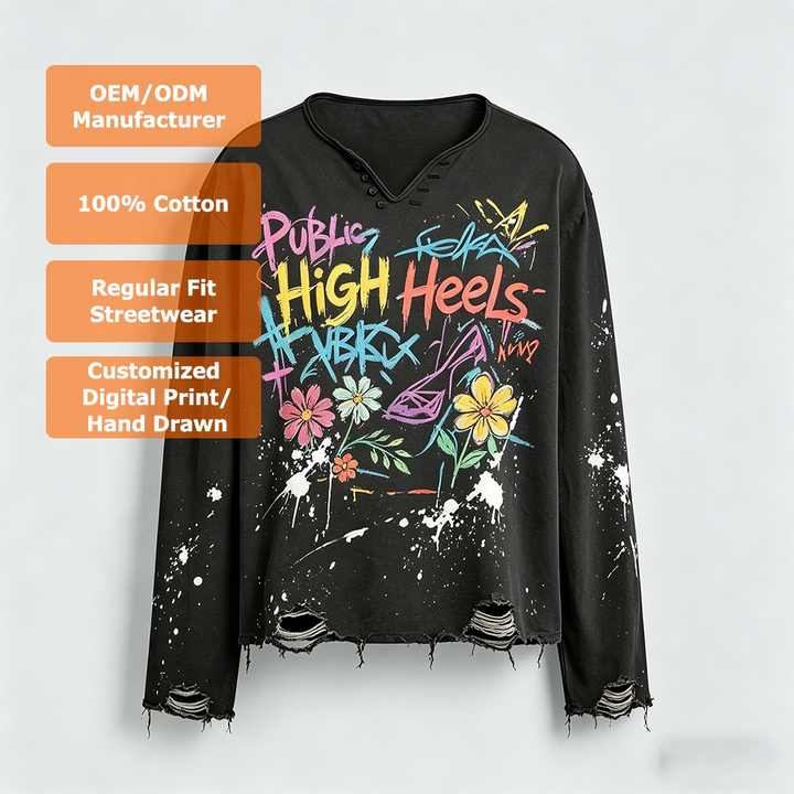 T-shirt Homme à Manches Longues Personnalisé avec Impression Numérique Effet Peinture Éclaboussée et Dessin Manuscrit Vieilli – Fabrication ODM Haut de Gamme