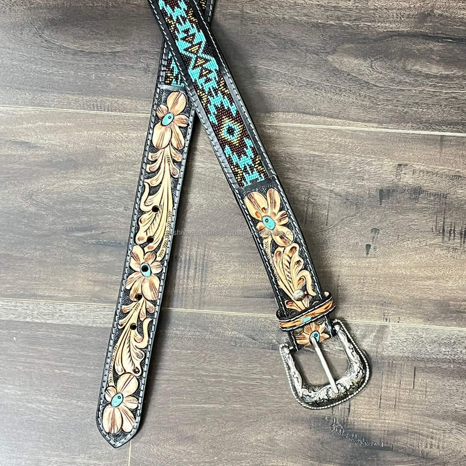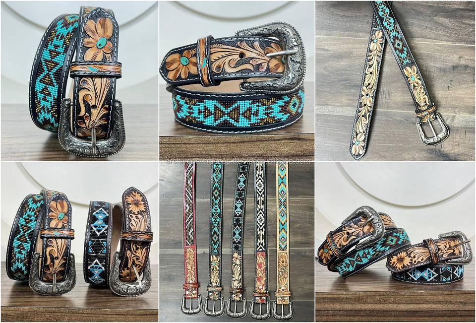 Hand Tooled Leather Beaded Pin Buckle Belt