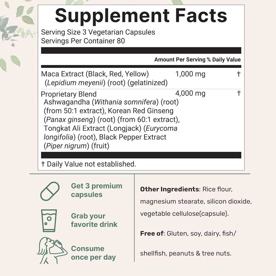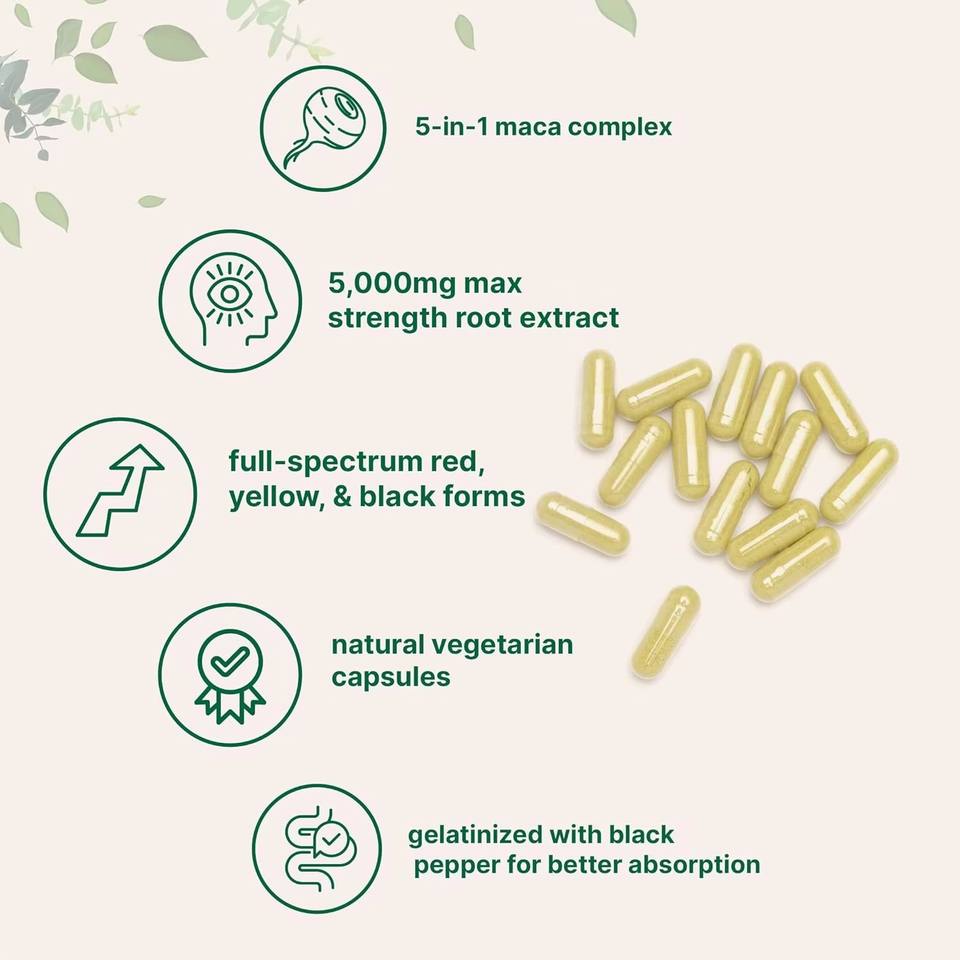 Capsules de Maca Gélatinisées pour Adultes, Marque Privée ODM/OEM, Mélange de Poudre Jaune, Rouge et Noire, Supplément Biologique pour la Gestion de l'Énergie