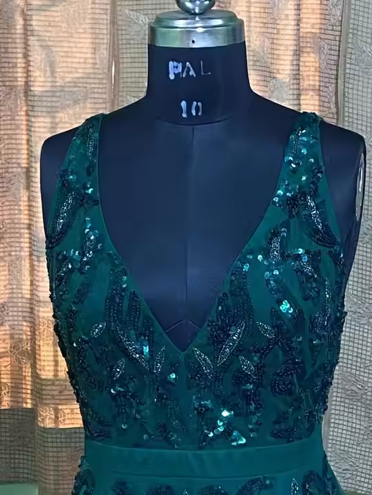 ODM robe de soirée simple décolleté en V sans manches vert trompette tulle sequin perle brodé satin non tissé personnalisé