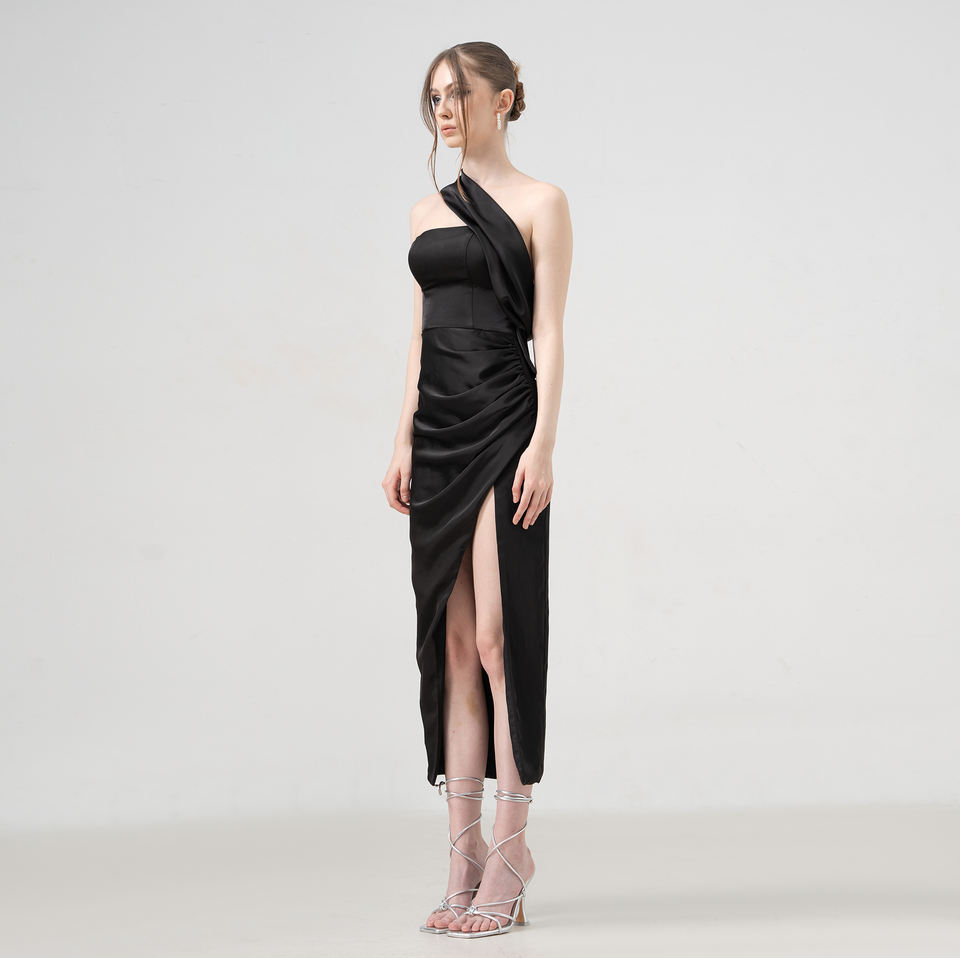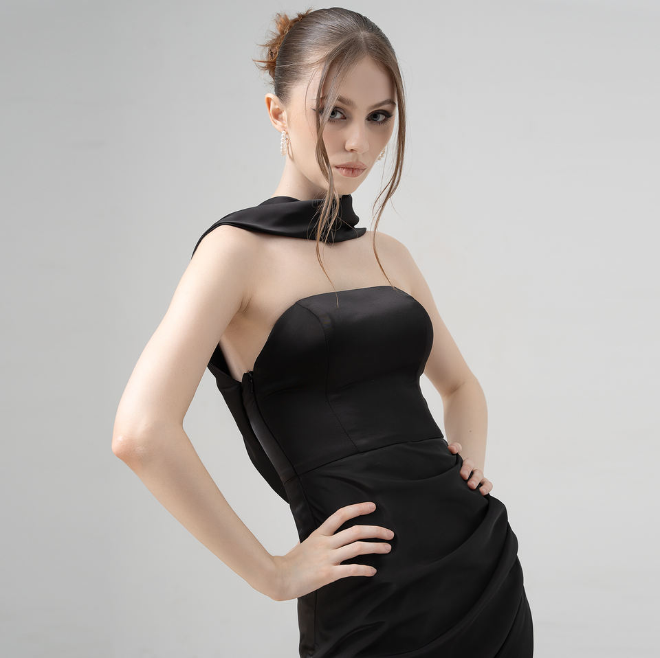 Techniques:Robe moulante en satin avec drapé rassemblé et rembourrage intégré.