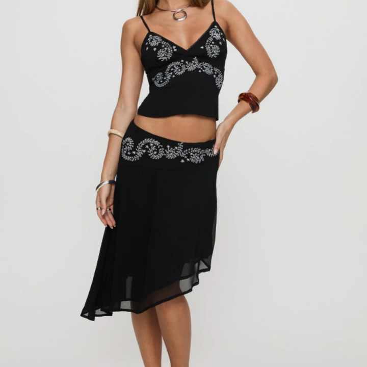 OEM 2025 Nouveauté Ensemble Femme Brodé Coton Lin Été Col Asymétrique Haut Jupe Longue Étages Décontracté Longueur Genou
