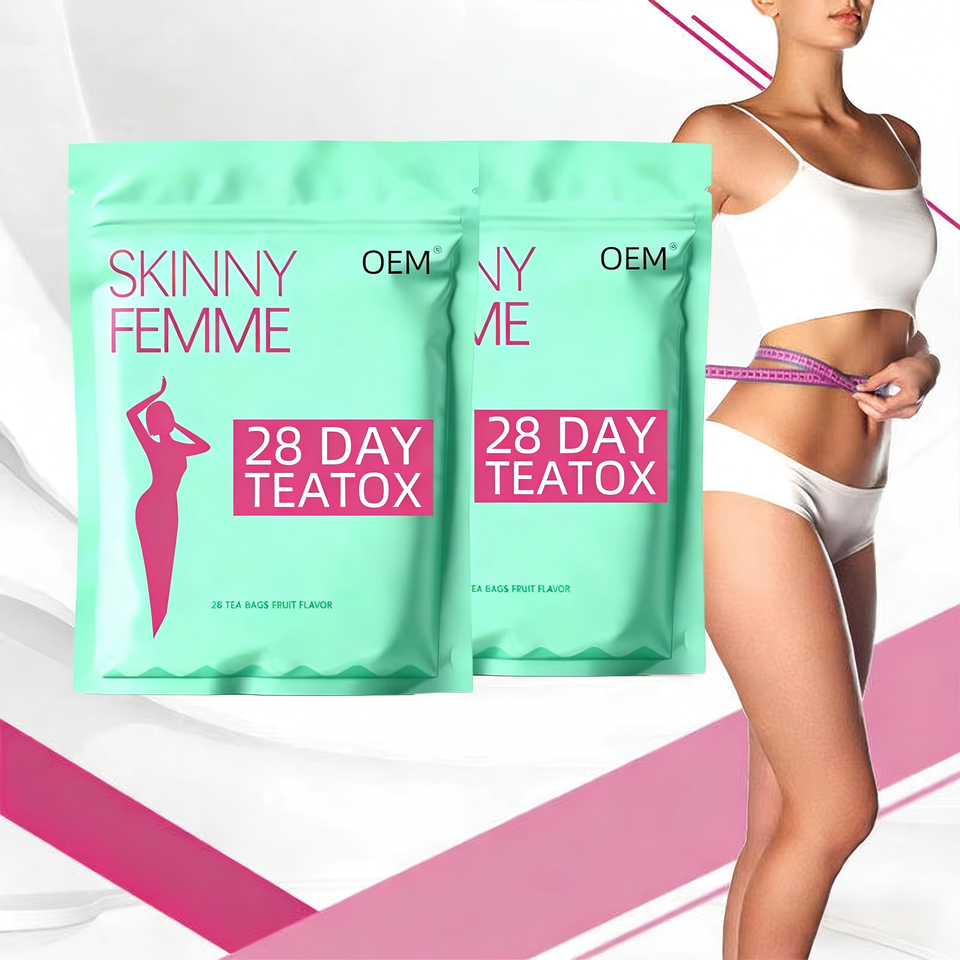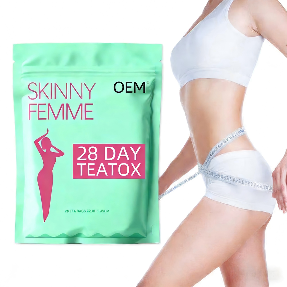 Thé détoxifiant OEM 28 jours pour le nettoyage du côlon, thé amincissant aux herbes avec gingembre, menthe poivrée, fenouil et saveur fruitée