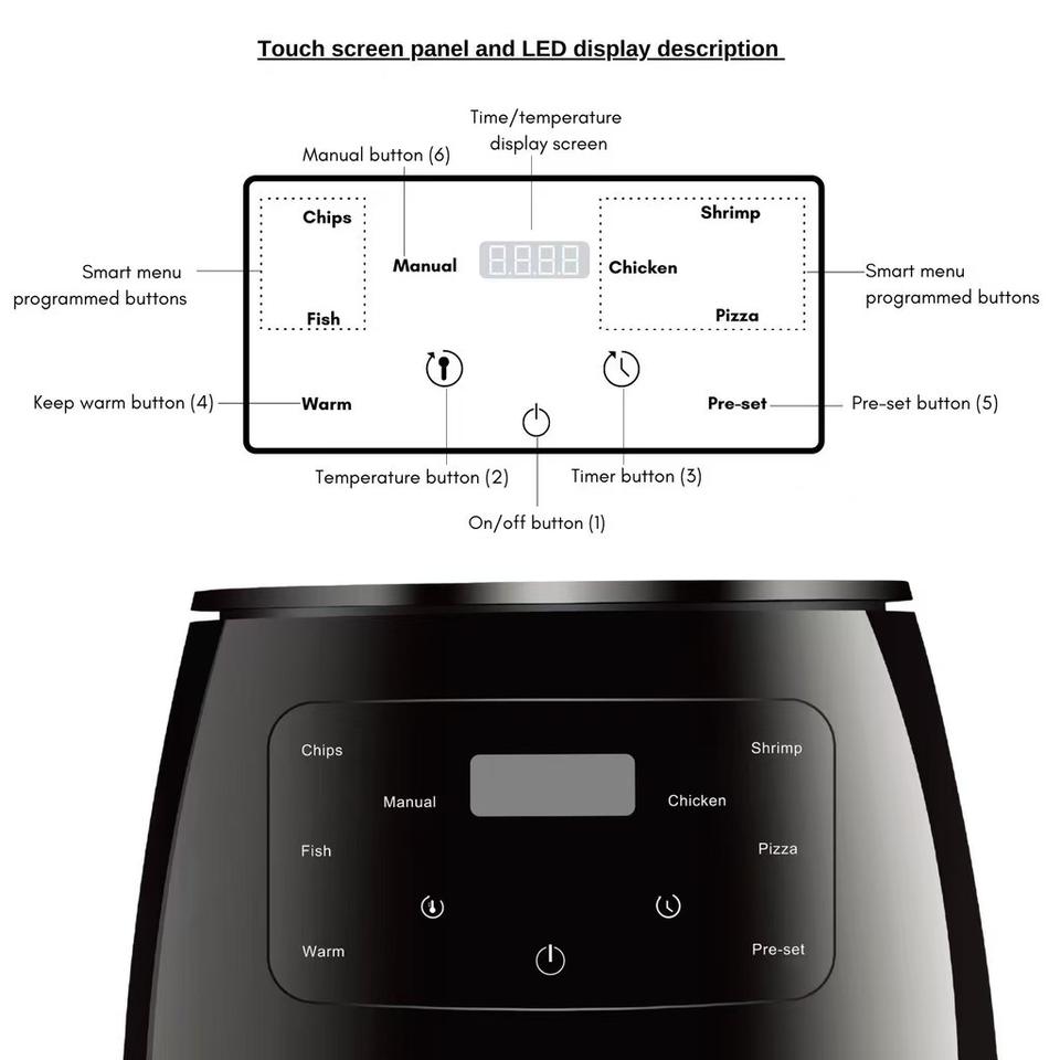 Fonction:Surface de suisson anti-adhésive, Contrôle de thermostat réglable, Protection contre la surchauffe, Avec Voyant, Multi-Fonction, LED D'affichage, Friteuse à Air, rôti, cuire au four, déshydrateur en un, Friteuse d'air, cuisson, Rôti, Opération facile, Grill, Sans huile