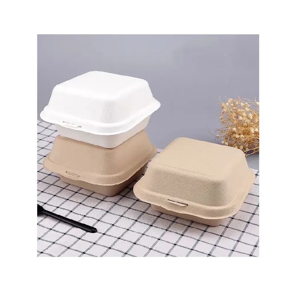 Emballage de fast-food jetable écologique accepté par OEM Stratification mate de boîte de burger de bagasse/pulpe de bambou en relief pour emporter