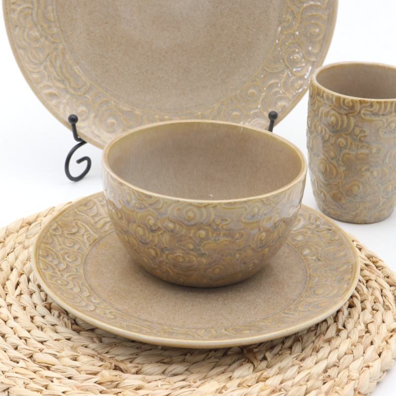 Assiettes à steak en céramique beige mat en grès OEM ensembles bol et mugs vaisselle western vintage gaufrée