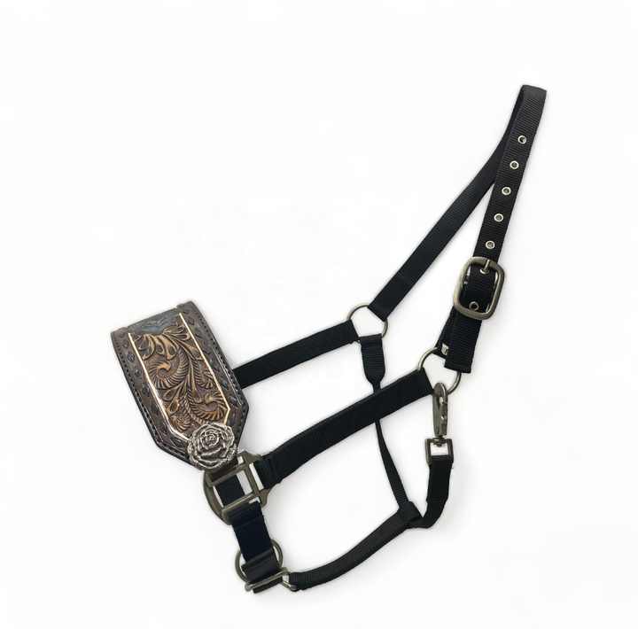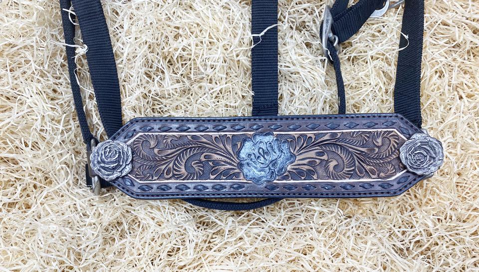 Horse Bronc Halter With Black Raw Hide Bradding & Rose CarvingProduct Name