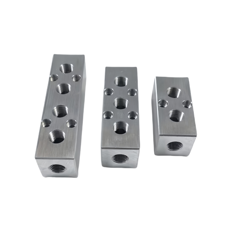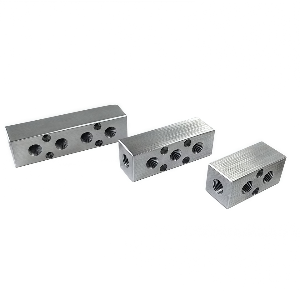 Bloc de distribution d'eau et de gaz en aluminium CNC OEM, droit, multi-trous, avec raccords femelles pour drain et collecteur d'eau