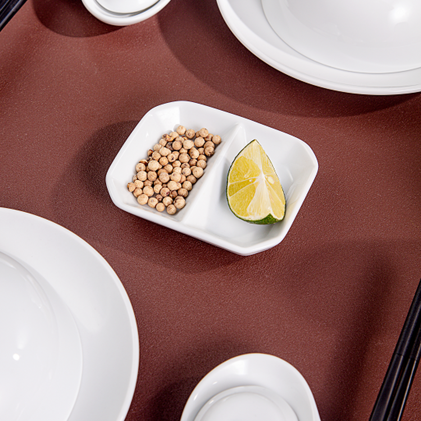 Assiette à condiments OEM de restaurant, assiette à condiments en porcelaine avec 2 compartiments, vente en gros fabricant pour restaurants