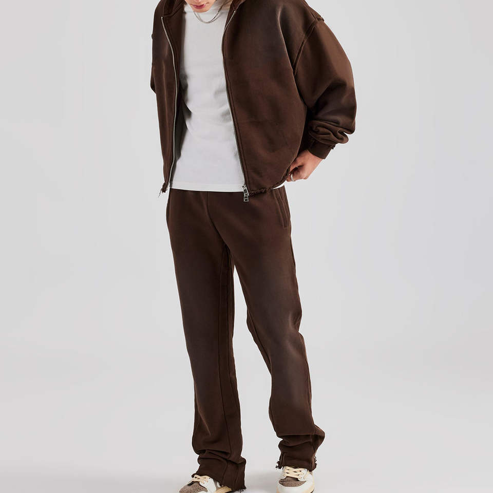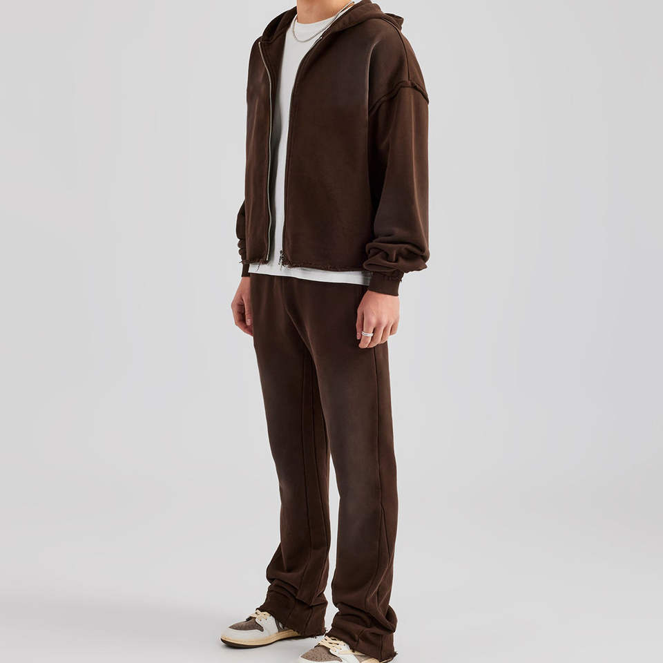 Survêtements personnalisés OEM à capuche en coton 100% délavé à l'acide avec poches zippées, confortables et durables, ensemble deux pièces pour activités de plein air