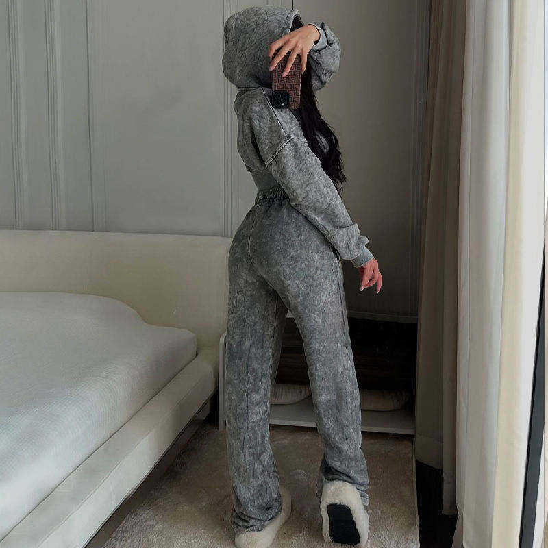 Ensemble de survêtement vintage pour femme, personnalisé OEM, délavé à l'acide, comprenant un sweat à capuche court et un pantalon de jogging en molleton de coton