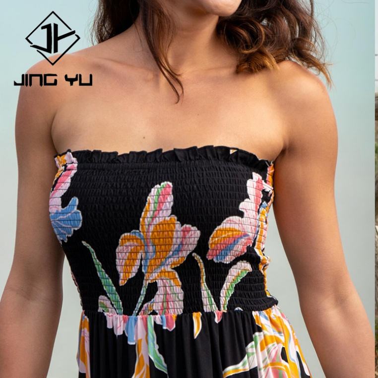 Robe maxi asymétrique plissée sans bretelles à imprimé plage personnalisée OEM, en lin et viscose de haute qualité
