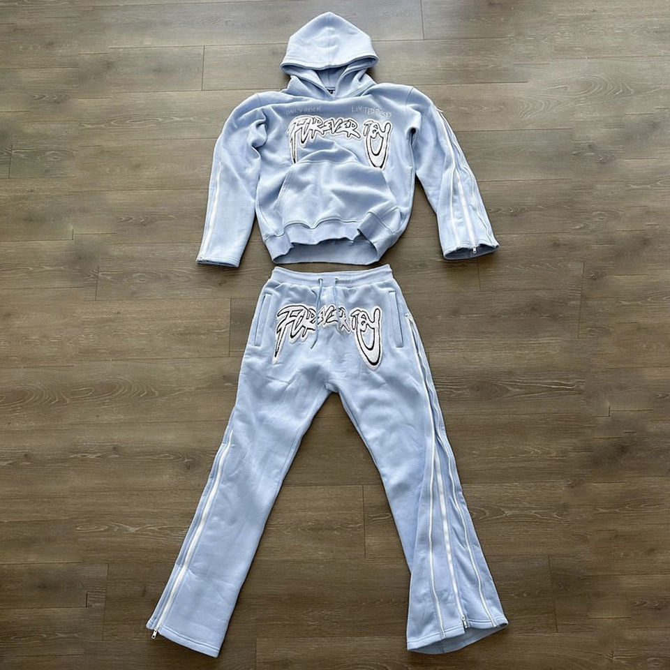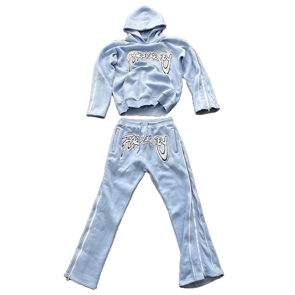 OEM survêtement brodé de chenille personnalisé survêtement à fermeture éclair à manches avec couture latérale pantalon de survêtement évasé pour hommes ensembles de deux pièces