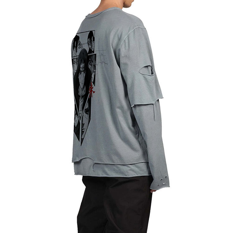 T-shirts pour hommes personnalisés OEM en coton oversize, lavés, imprimés à l'écran, à double couche, à manches longues, coupe carrée, courts, déchirés et usés