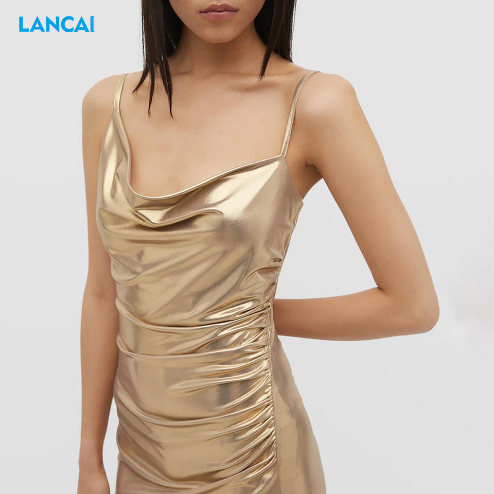 Robe de soirée sexy Spice Girl à la mode à design personnalisé OEM Robe longue plissée fendue à bretelles en satin métallisé doré sans manches