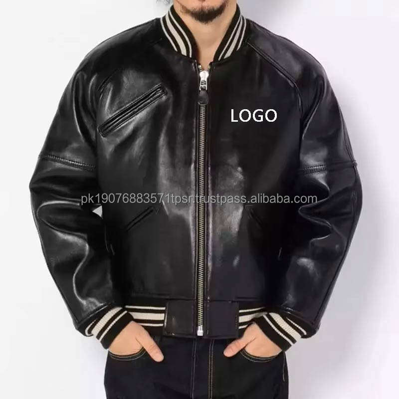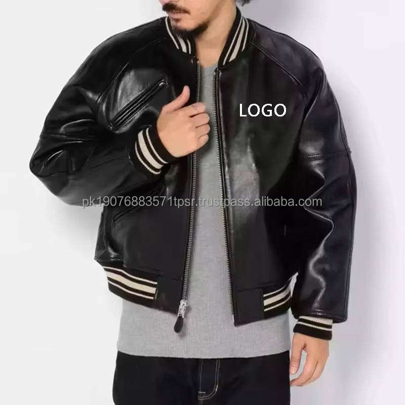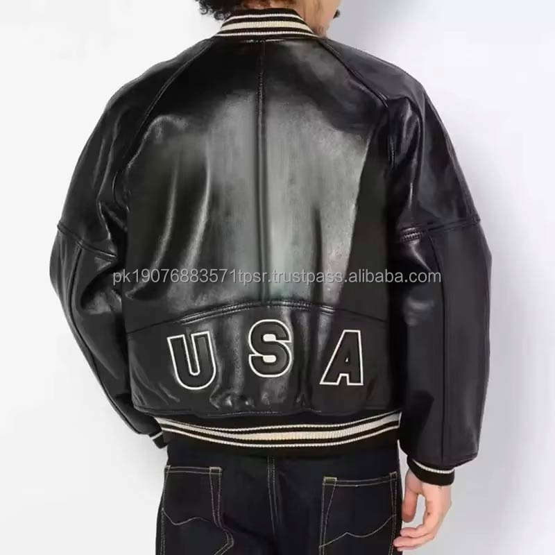 Veste bomber en cuir PU noir brodée de haute qualité, design personnalisé OEM, veste zippée pour hommes, veste de baseball pour hommes