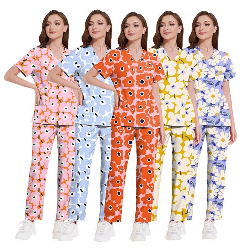OEM Custom Fashionable New Design Beautiful Printed Suits Surgical Scrubs Uniforms Hospital Breathable Nurse Scrub Set for Women