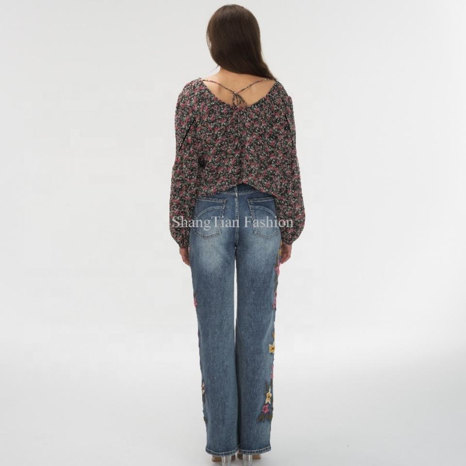 Jeans baggy pour femmes, coupe basse, délavés à l'acide, style vintage, broderie florale personnalisée OEM