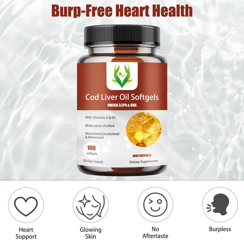 Huile de foie de morue en mini-gélules OEM, formule personnalisée, oméga-3 avec vitamines A et D3, soutien cardiaque et cutané, huile de poisson en marque blanche