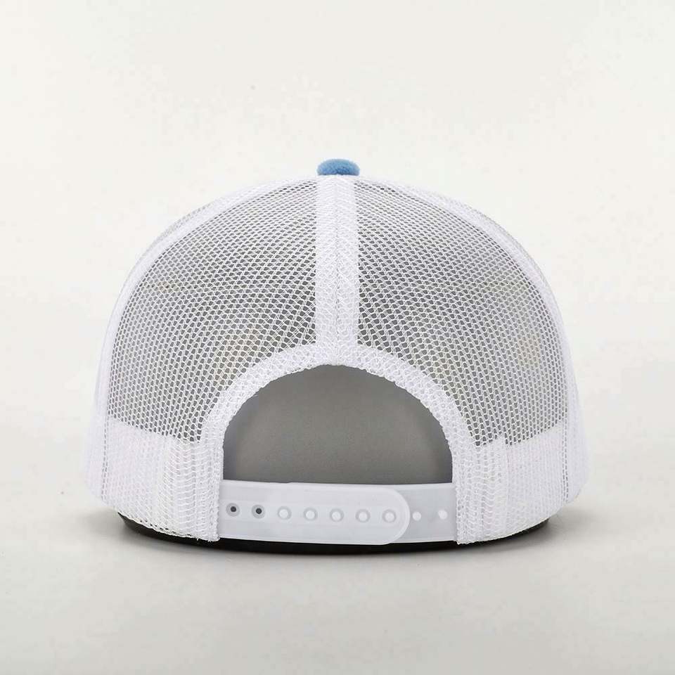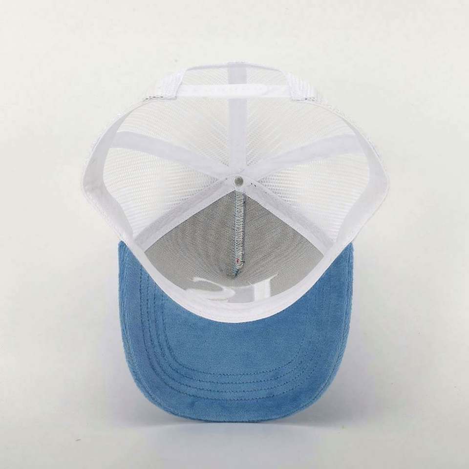 Casquette Trucker OEM Personnalisée de Haute Qualité à 5 Panneaux pour Hommes et Femmes, avec Logo Brodé 3D, en Velours Bleu Ciel et Maille, Fermeture Snapback