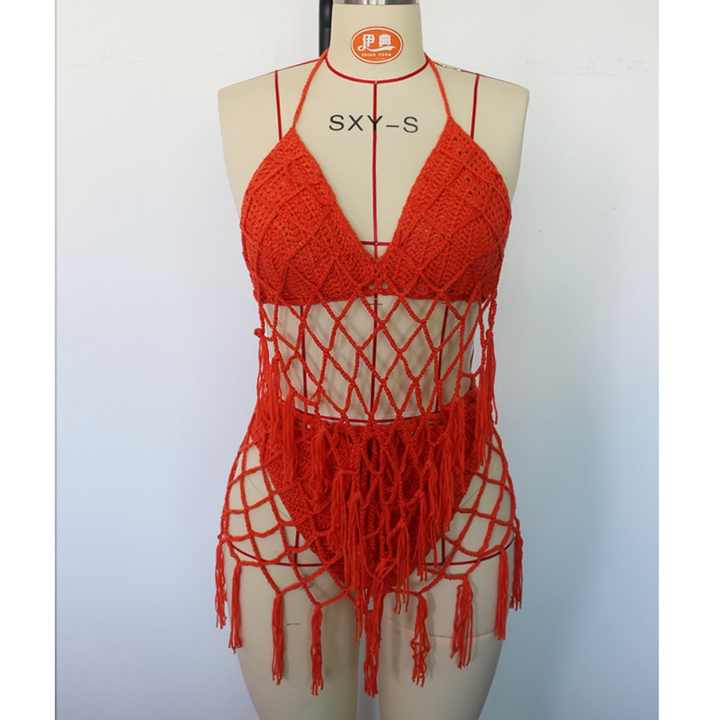 Ensemble de bikini en crochet à pompons personnalisé OEM de haute qualité, maillot de bain sexy ajouré fait main avec paréo pour femme, tenue de plage