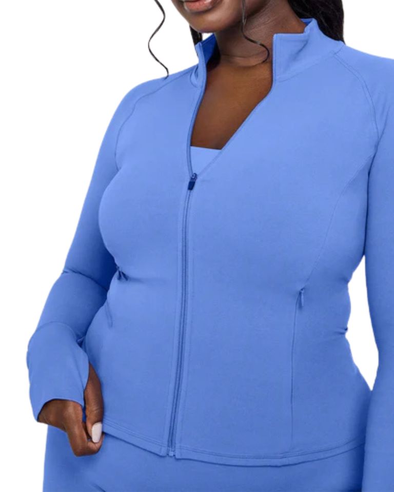 Veste de yoga personnalisée OEM pour femme, manches raglan, grande taille, fermeture éclair intégrale, col montant, passe-pouces, coupe ajustée, respirante, légère, devant